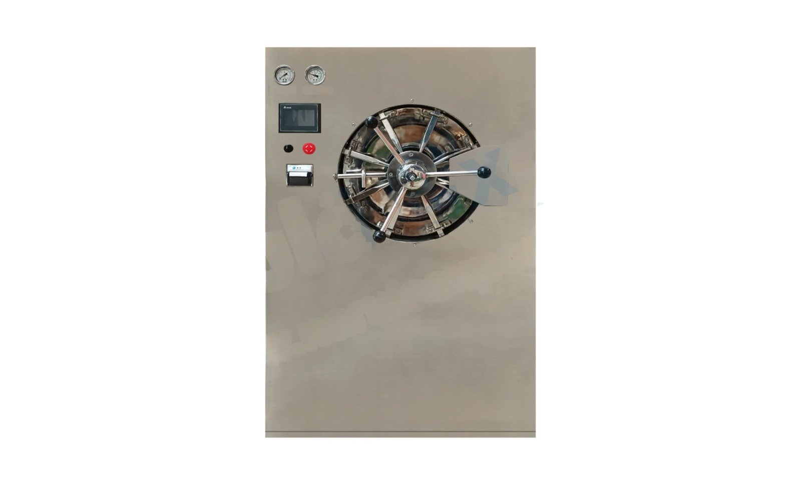 Sterilizer has hinged self-locking single piece thick S.S. 316/304 plate door and cannot be opened when under pressure. The self-locking device automatically disengages the thread mechanism when the sterilizer is under pressure to preclude any eventuality of accident.